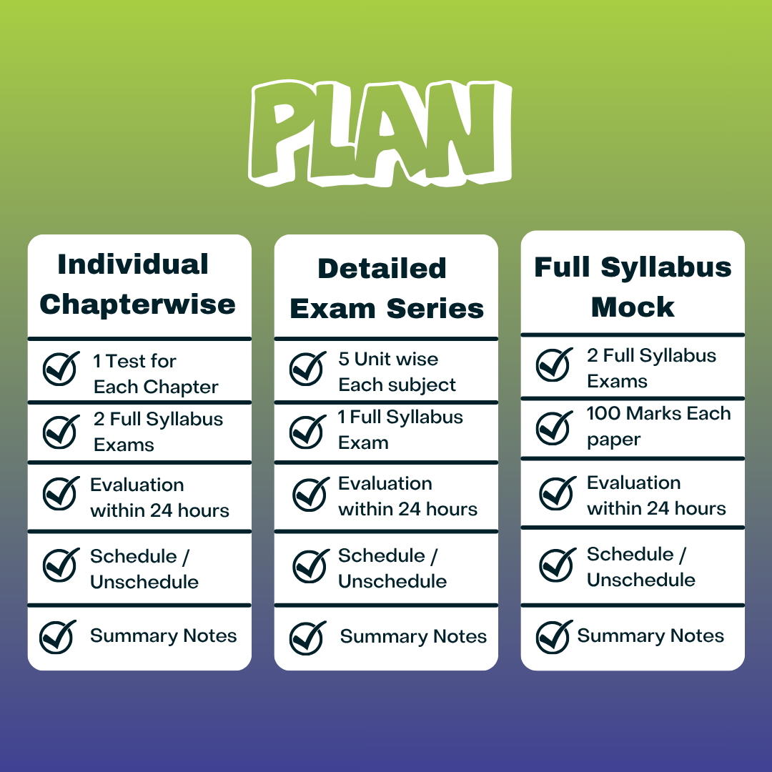 We understand that sometimes aspirants have a lot going in their life than just exams and there are times when you cannot make it to the date of the test. That is why this plan is perfect for you. Once you buy this plan, you will be able to download all the test series in one go and then you can solve them at your own convenience. You will still get the evaluation done in 2-3 days of whenever you submit. Here you get 5 Chapter Wise tests for each subject and 2 Full Syllabus test for each subject along with counseling by a CA.
